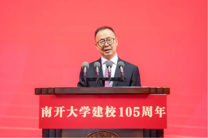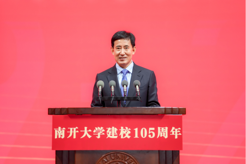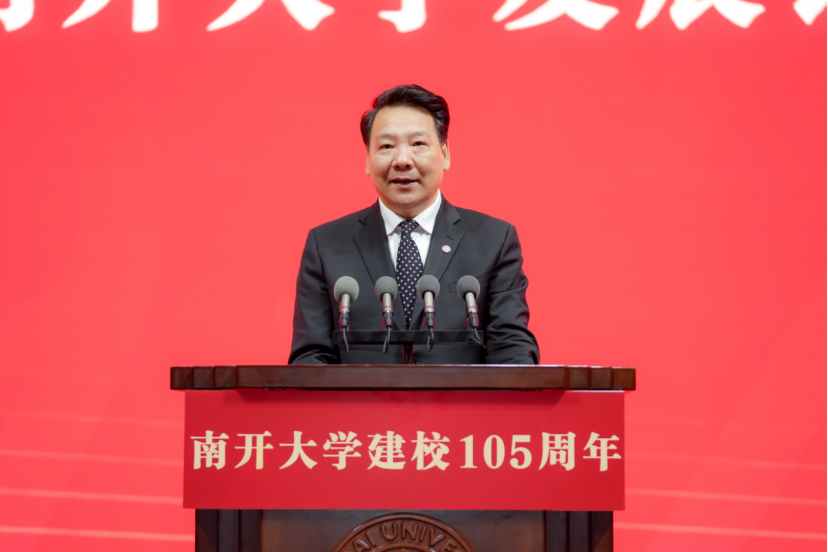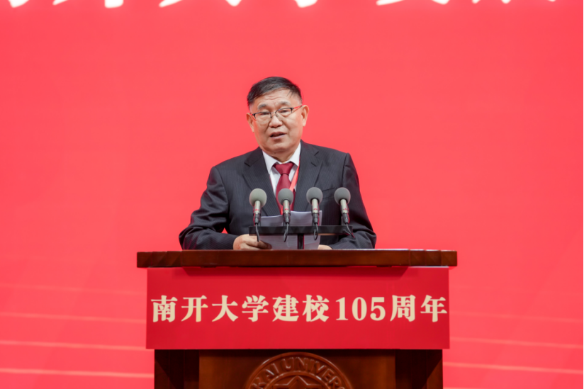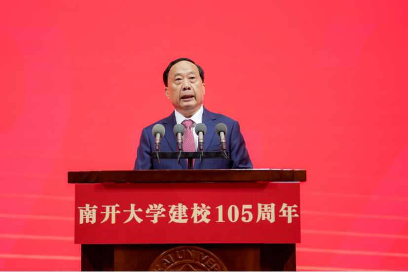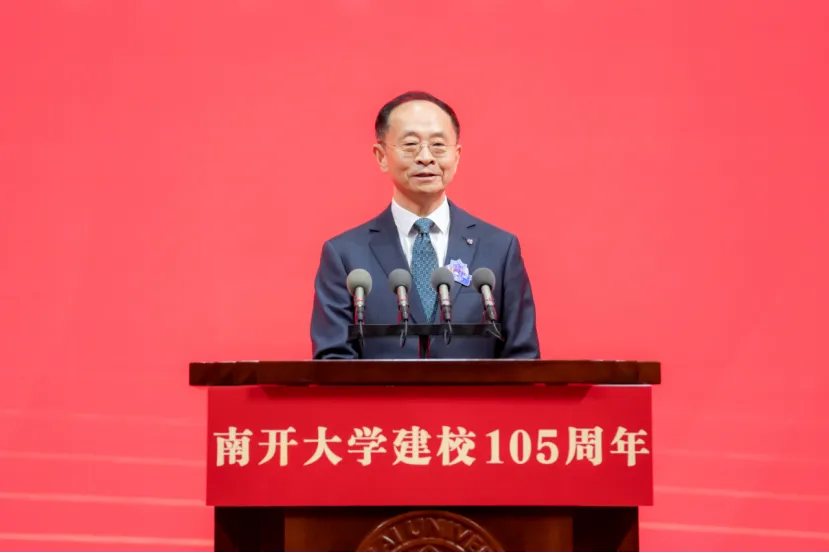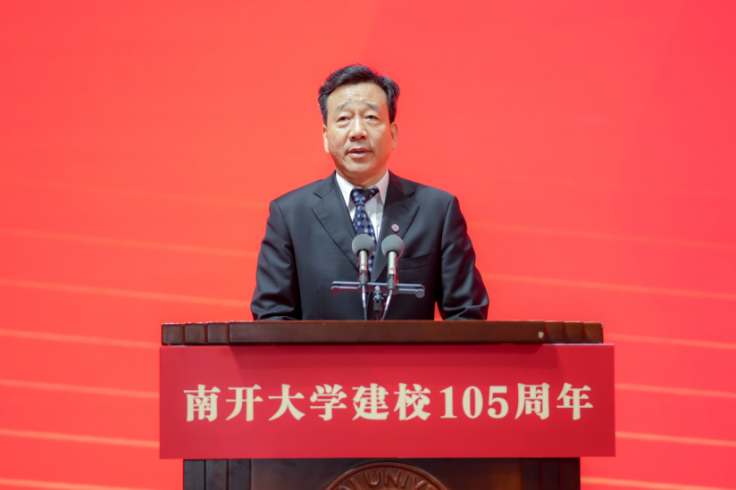 陈雨露代表学校向关心支持南开发展的社会各界人士、海内外全体校友表示衷心感谢。他在致辞中说,105年来,一代代南开人在“爱国、公能、创新、奋斗”的南开精神鼓舞下,积极投身民族独立、国家富强、人民幸福的宏基伟业之中,走出了一条与民族共命运、与时代相偕行的奋进之路。回望百年波澜壮阔的奋斗征程,南开爱国担当厚重深远,南开英才辈出勇当脊梁,南开奋楫争先引领发展。南开人始终坚持爱国、爱党、爱社会主义高度统一,以心系家国的深沉情怀和广阔格局,勇往直前,激励中华儿女奋发图强;始终坚持“允公”“允能”融于一身,以执着坚守的勇毅品格与忘我奉献的高尚情操谱写无怨无悔的报国华章;始终传承弘扬创新精神,以原创性思想、变革性实践和突破性成果助力民族复兴的车轮步步向前。
