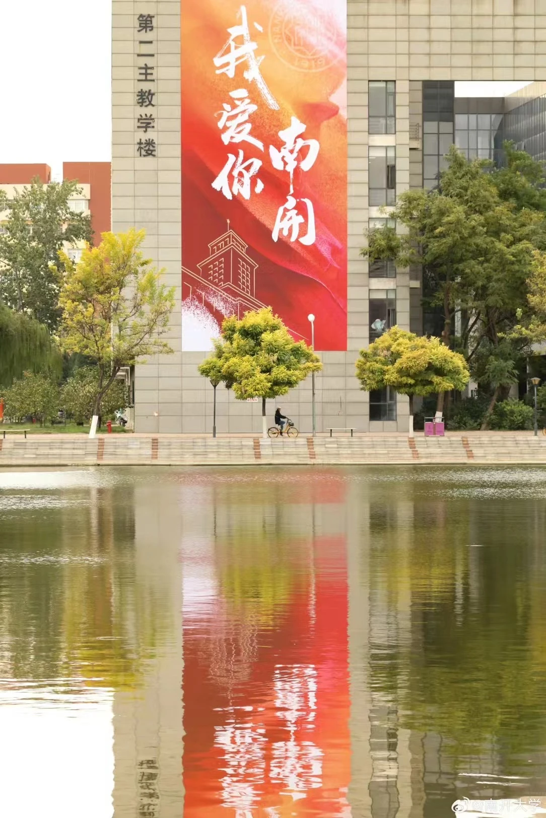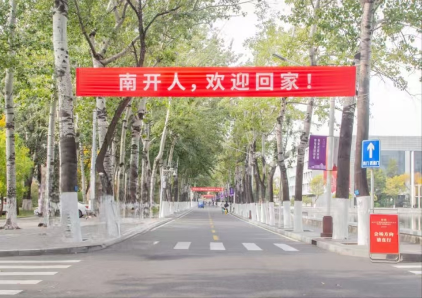 主教学楼前周恩来总理塑像巍然矗立,马蹄湖、新开湖碧波轻漾,大中路上“南开人,欢迎回家”的红色横幅格外醒目,南开园处处焕发着勃勃生机,洋溢着喜庆热烈的氛围。