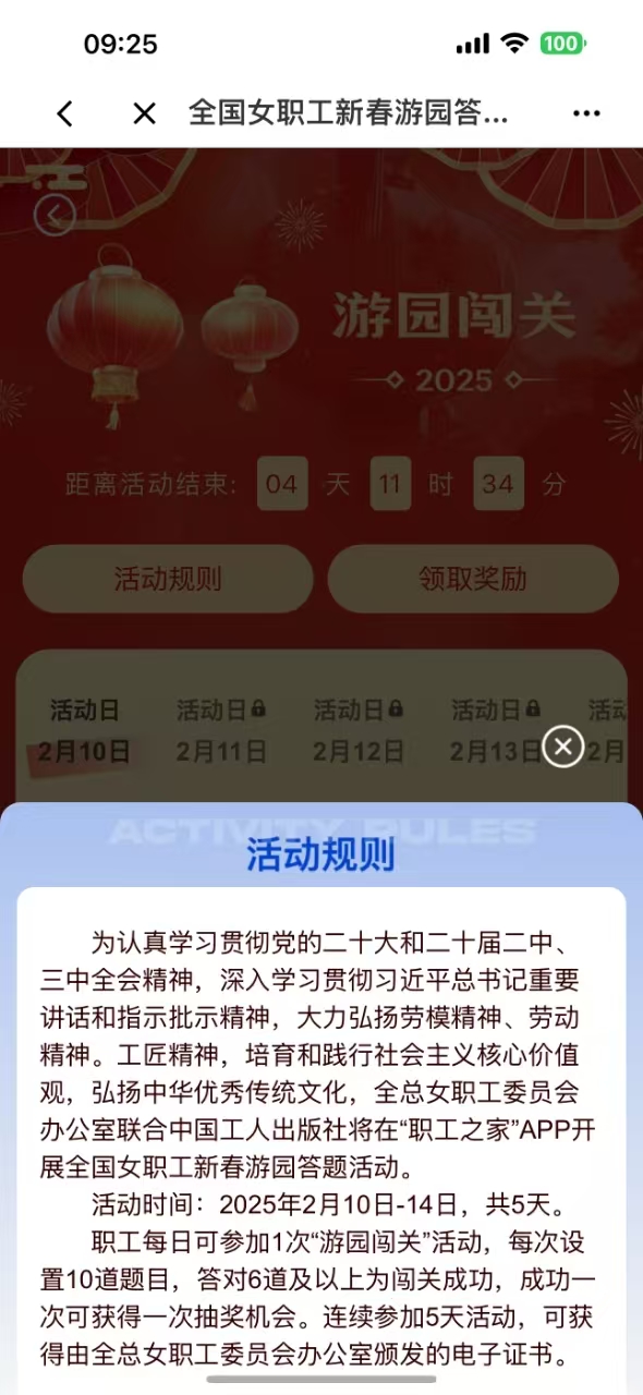校工会通知,从2月10日(今天)上午9:00开始,在“职工之家”APP中开展全国女职工新春游园答题活动(主页流动标题新闻第二个),为期5天,参加活动可获得奖励,今年的三八节系列活动就此拉开帷幕,请女职工积极参与!