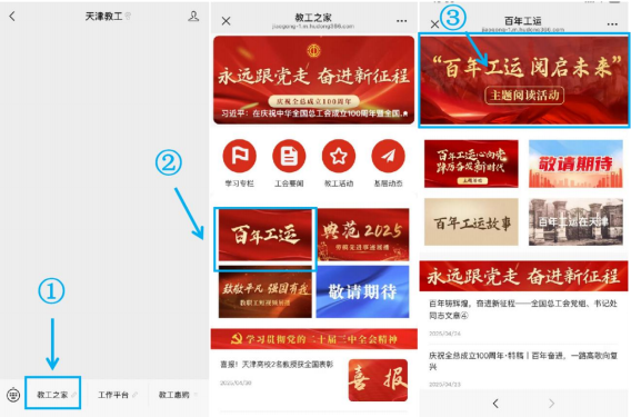 1.关注“天津教工”微信公众号,点击“教工之家”—“百年工运”栏目,进入“百年工运 阅启未来”主题阅读活动。