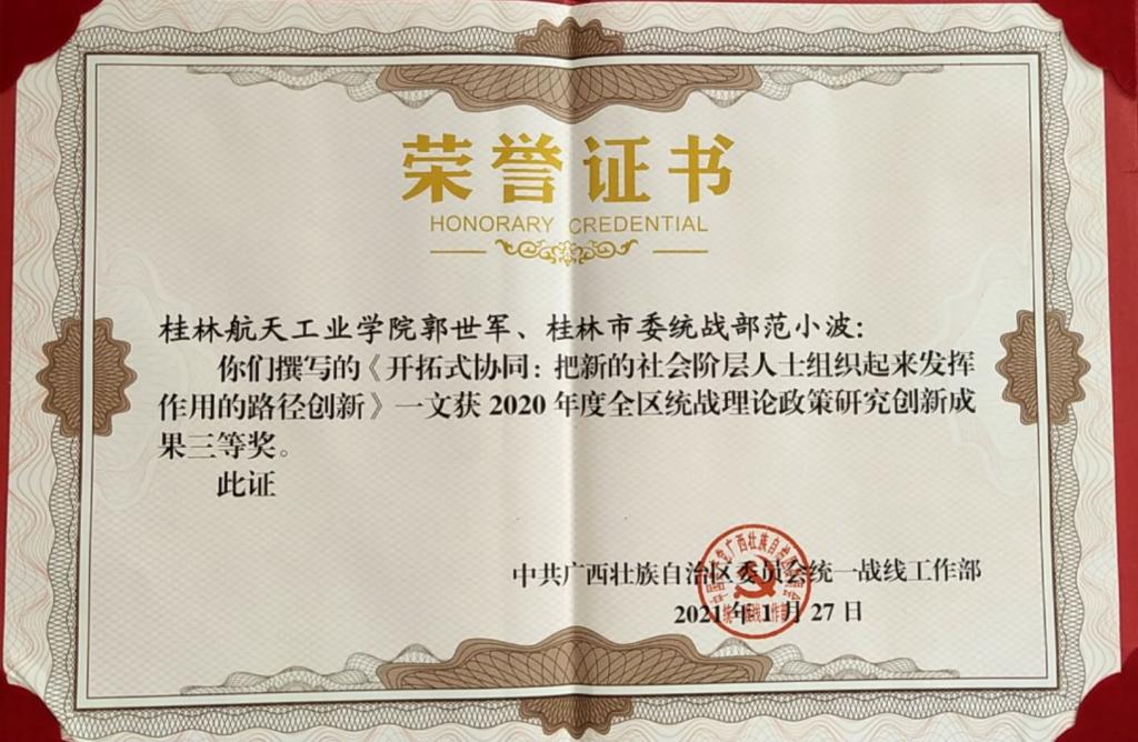 近日,2020年广西理论政策研究创新成果奖公布,pp电子教师郭世军博士和桂林市统战部范小波联合撰写的《开拓式协同:把新的社会阶层人士组织起来发挥作用的路径创新》,获得2020年度全区统战理论政策研究创新成果...