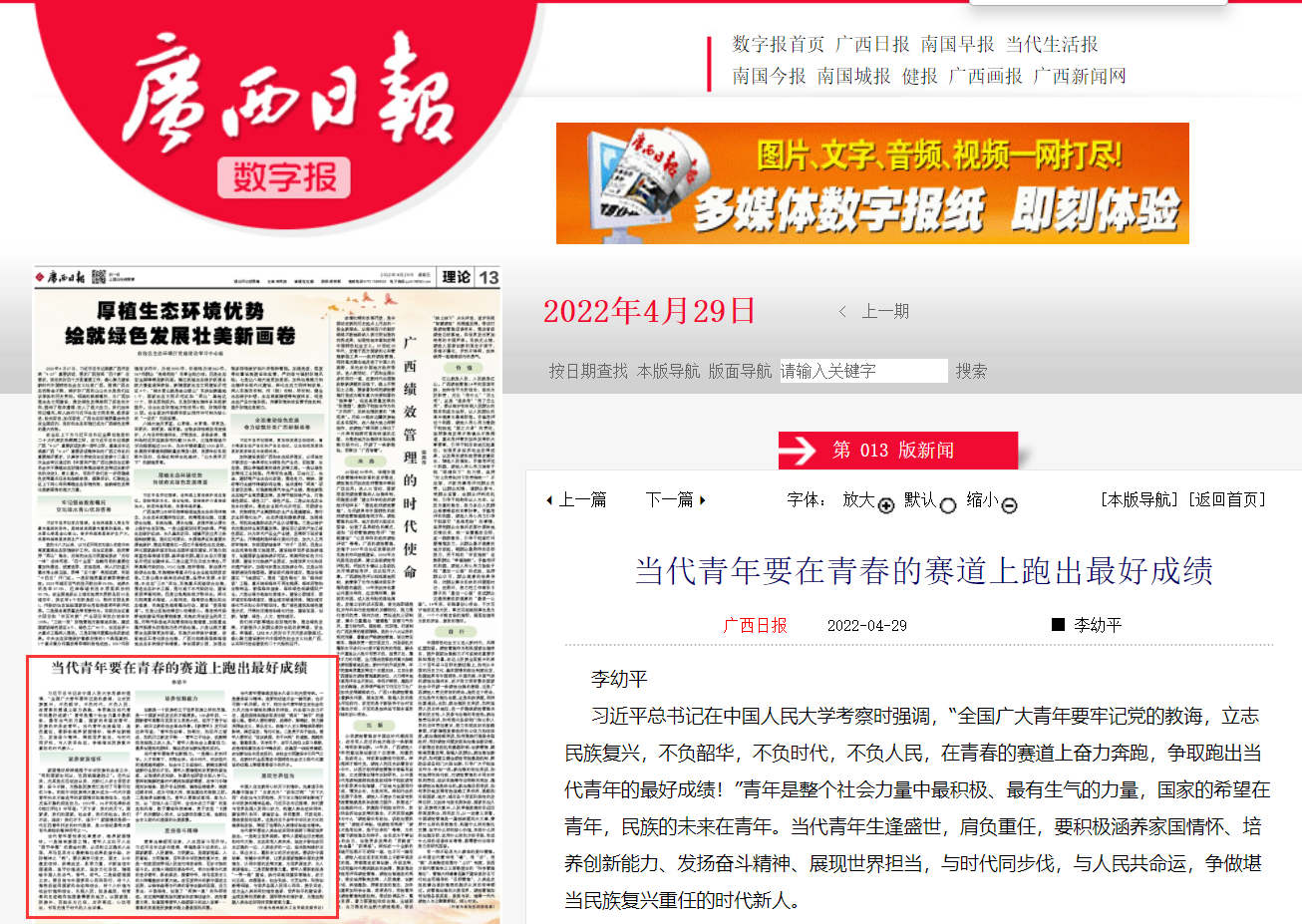 2022-04【广西日报】理论版刊发李幼平书记文章:当代青年要在青春的...