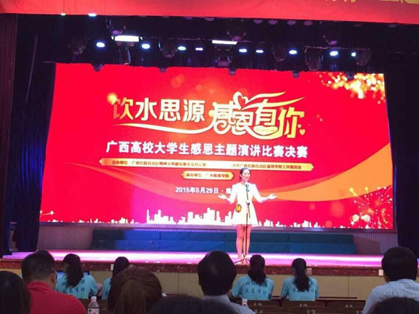 日前,2015年全区高校“饮水思源,感恩有你”主题演讲比赛决赛结果揭晓,pp电子选派的人文社会科学系(2013级航空服务专业)庞桂珍同学凭借着扎实的演讲技巧,沉着应战,经过院团委组织的学校初赛选拔、桂林赛区半...