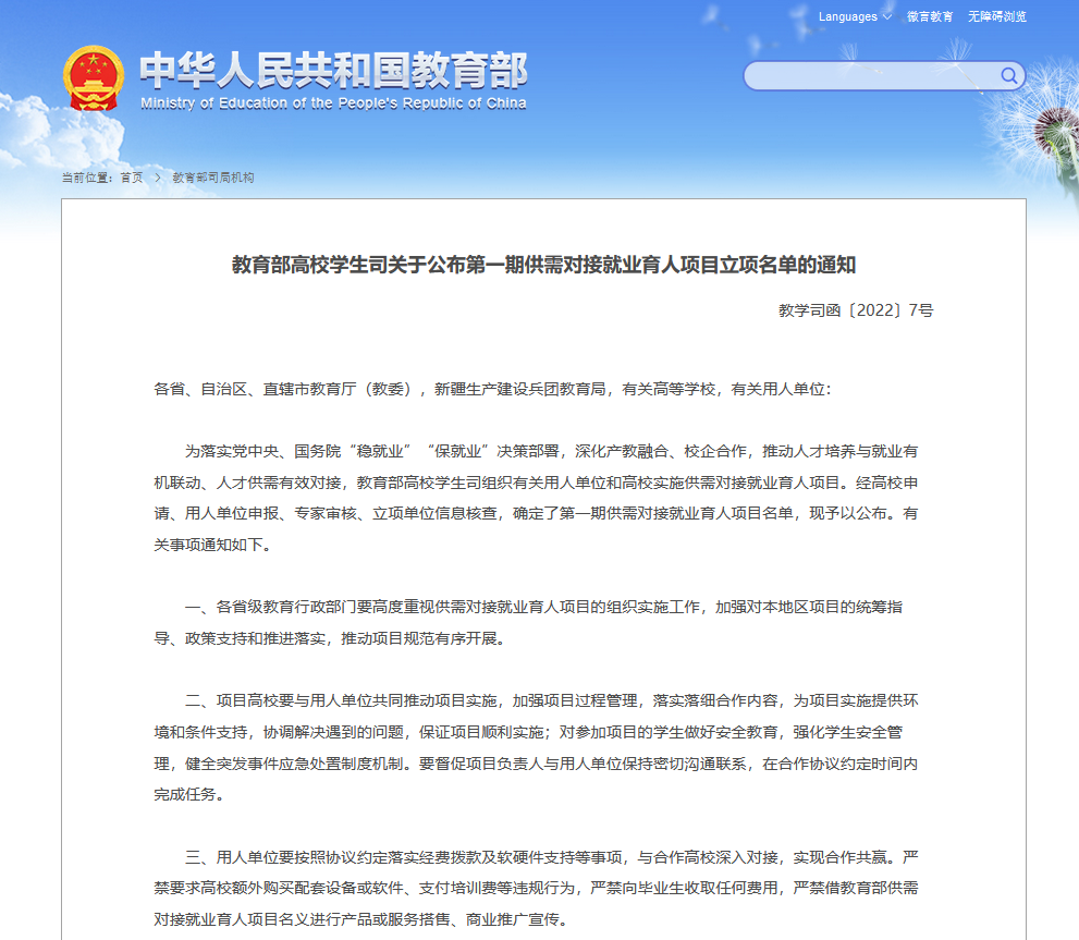 近日,教育部公布了2022年第一期供需对接就业育人项目立项名单。根据《教育部高校学生司关于公布第一期供需对接就业育人项目立项名单的通知》(教学司函〔2022〕7号),pp电子获批立项3项,获批项目行业涉及教育、...