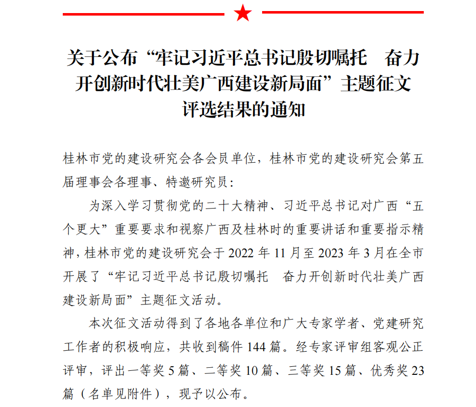 近日,桂林市党的建设研究会公布了“牢记习近平总书记殷切嘱托 奋力开创新时代壮美广西建设新局面”主题征文比赛获奖名单,pp电子共选送八篇文章,三篇获奖。其中徐艺萍老师文章《广西瑶族礼仪文化短视频的中华民族...