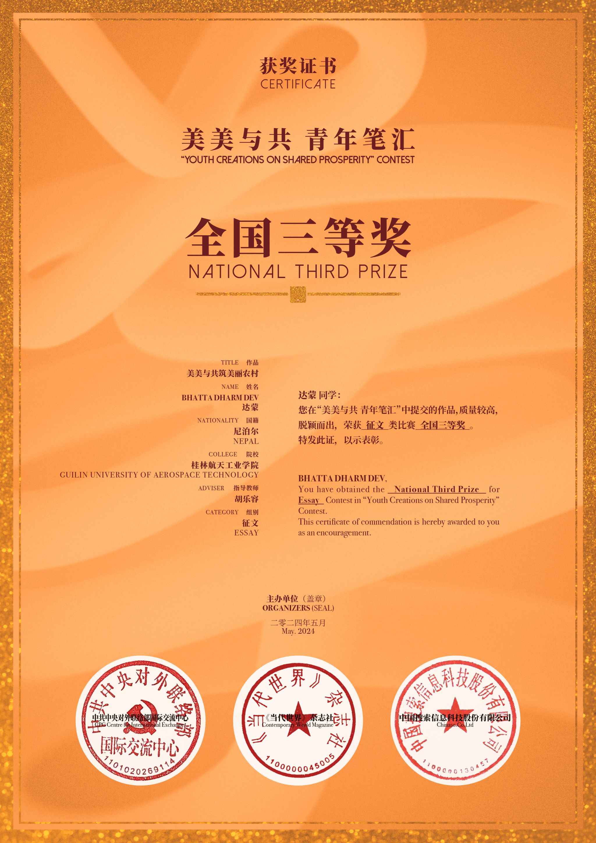 近日,由中共中央对外联络部国际交流中心等单位联合主办的“美美与共青年笔汇”活动公布获奖名单,pp电子尼泊尔籍教师BHATTA DHARM DEV(达蒙)提交的作品《美美与共筑美丽农村》荣获征文类比赛全国三等奖。达蒙提...