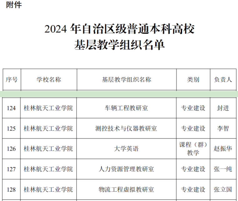 根据《自治区教育厅办公室关于公布2024年自治区级普通本科高校基层教学组织名单的通知》(桂教办〔2024〕941号),pp电子车辆工程教研室、测控技术与仪器教研室、大学英语、人力资源管理教研室、物流工程虚拟教研室...