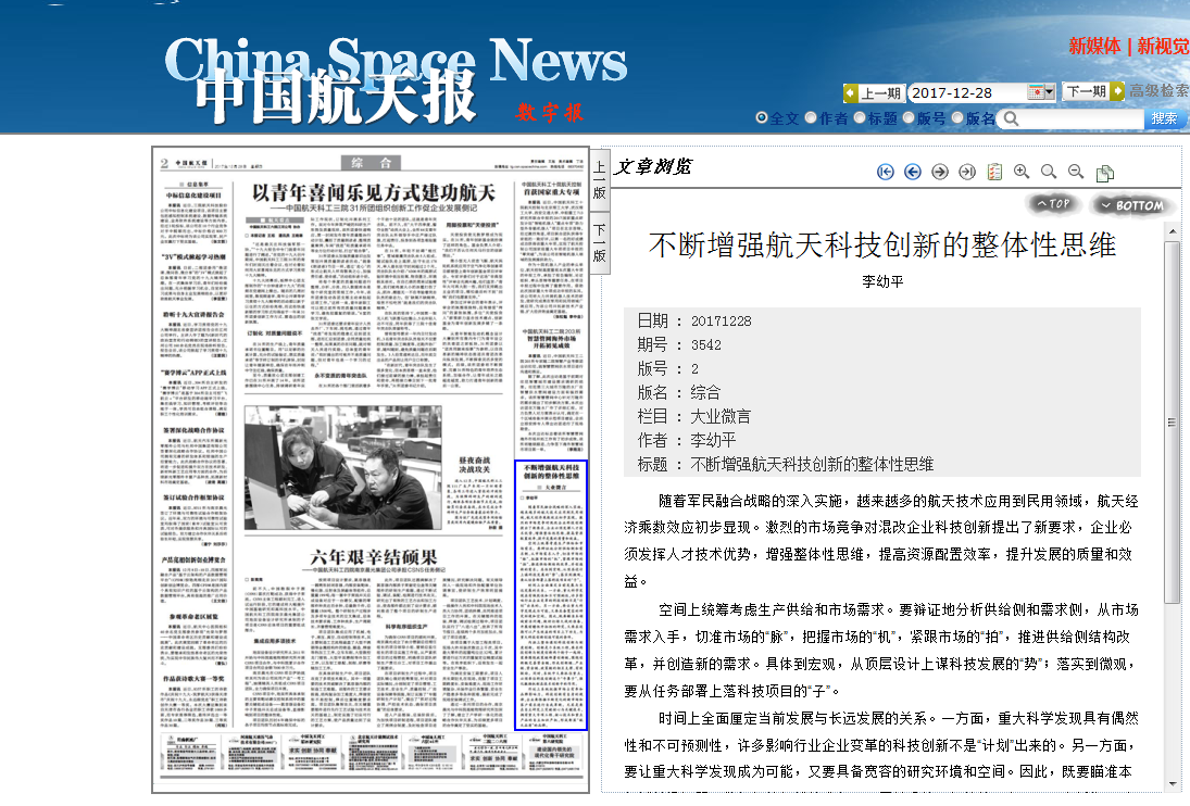 2018-01【中国航天报】中国航天报发表李幼平书记理论文章:不断增强...