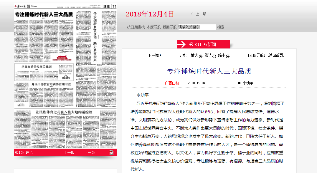 2018-12【广西日报】理论版发表李幼平书记文章:专注锤炼时代新人三...