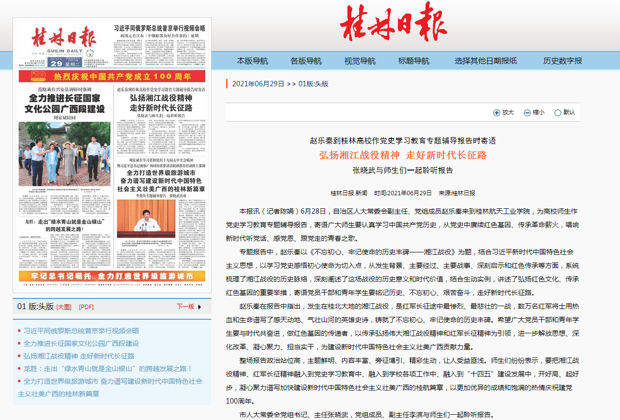 2021-06【桂林日报】赵乐秦到桂林高校作党史学习教育专题辅导报告时...