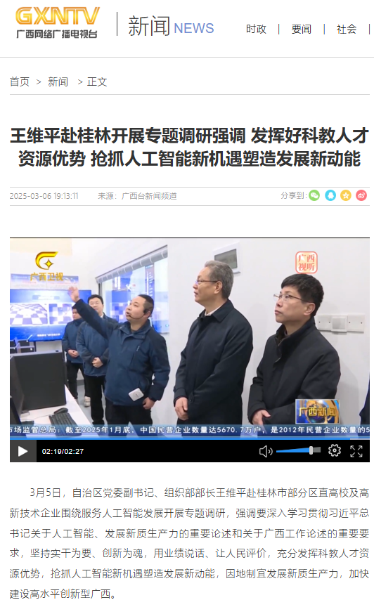 3月5日,自治区党委副书记、组织部部长王维平赴桂林市部分区直高校及高新技术企业围绕服务人工智能发展开展专题调研,强调要深入学习贯彻习近平总书记关于人工智能、发展新质生产力的重要论述和关于广西工作论述...