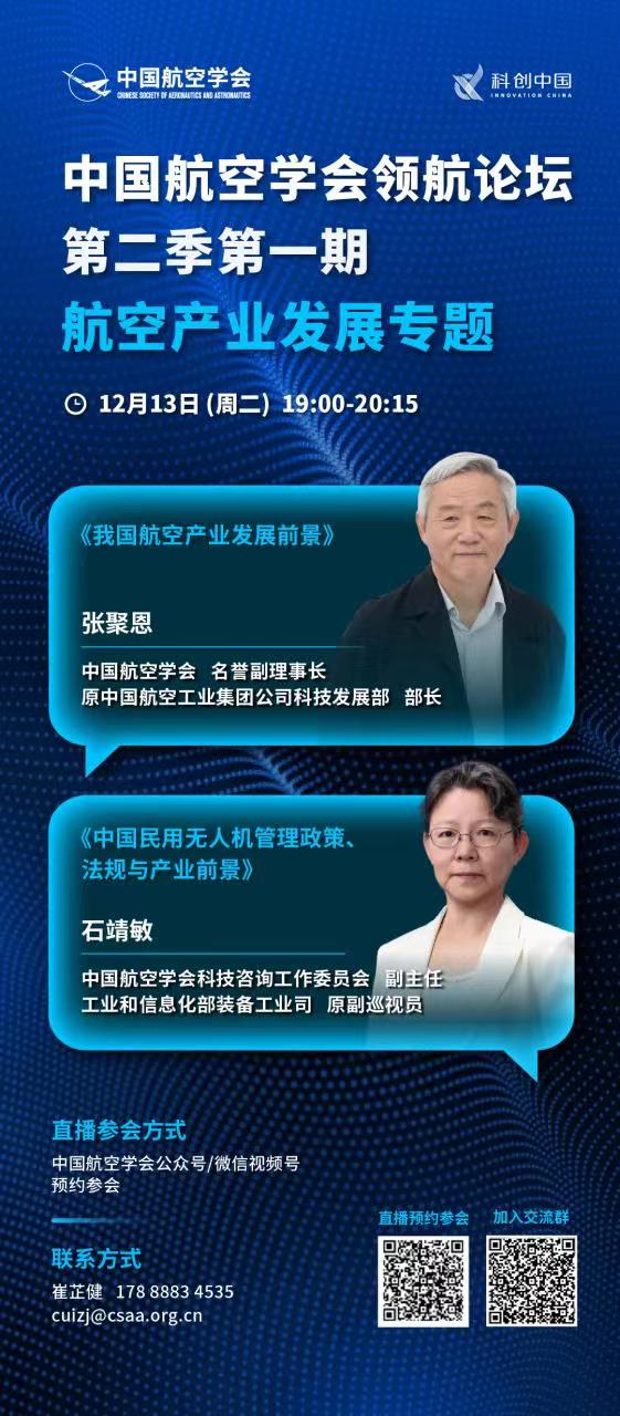 主讲:中国航空工业集团科技部部长张聚恩、工信部装备工业司原副巡视员石靖敏时间:12月13日(周二)19:00-20:15参会方式:中国航空学会公众号/微信视频号预约参