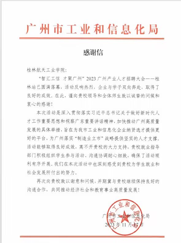 11月17日,广州市工业和信息化局来信向学校领导和全体师生表示问候,并感谢学校耐心细致的沟通协调和积极组织学生参加“智汇工信 才聚广州”2023广州产业人才招聘大会,使得活动取得良好成效。学校高度重视毕业生...