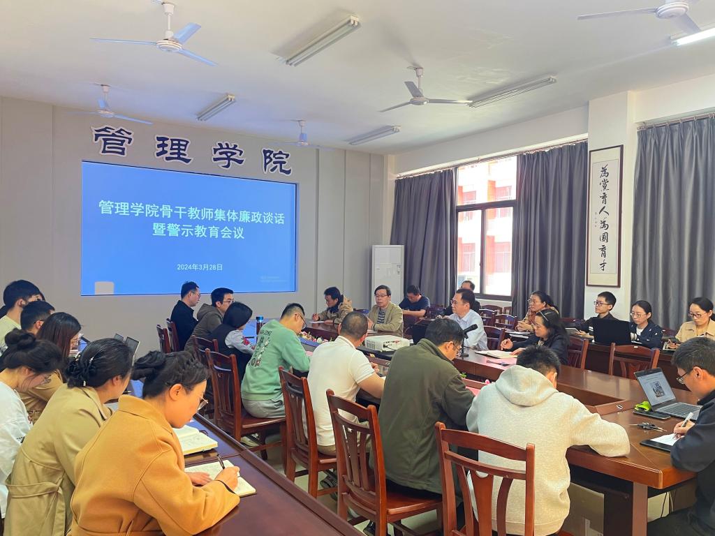 3月28日,管理学院组织开展集体廉政谈话暨警示教育,学院班子成员、教研室及实验室主任、专业负责人、支部书记、教师支部委员等参加会议。会议传达学习了学校2024年全面从严治党暨全面深化清廉学校建设工作会议精...