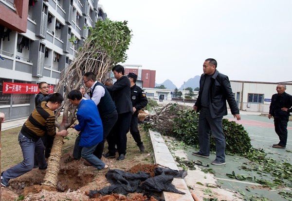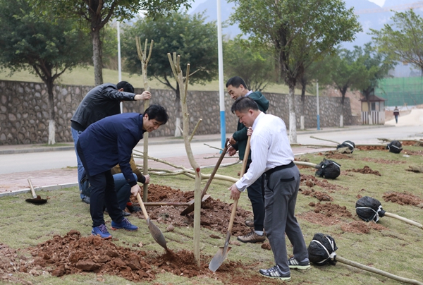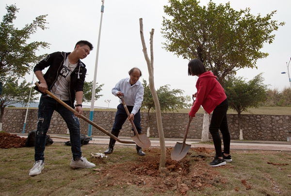 3月12日下午,在第40个全国义务植树节来临之际,pp电子师生在南校区开展2018年度植树活动。pp电子党委书记李幼平、校长易忠,党委副书记黄文韬、副校长杨杰,以及师生代表共同在天和苑宿舍区栽下近百棵树苗,为建设“美丽桂航”增添一抹靓丽的新绿。