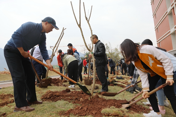 大家有序编组、分工协作,挽起袖子加油干。挖坑、搬苗、铲土、踩实、浇水……植树活动中,师生们兴致高昂,迅速投入植树志愿服务活动中。经过师生近一个小时的共同努力,桂花、紫微等珍贵苗木已在校园中昂然挺立,呈现出蓬勃生机。