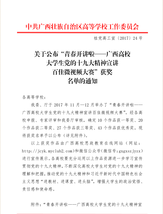 日前,由自治区高工委、自治区教育厅举办的“青春开讲啦——广西高校大学生党的十九大精神宣讲百佳微视频大赛”,由pp电子推选的微视频作品《美好生活的青春交响》在比赛中荣获一等奖。该作品由马克思主义学院高帅老师策划指导,机械工程学院的李晓斌等同学参与拍摄、制作。