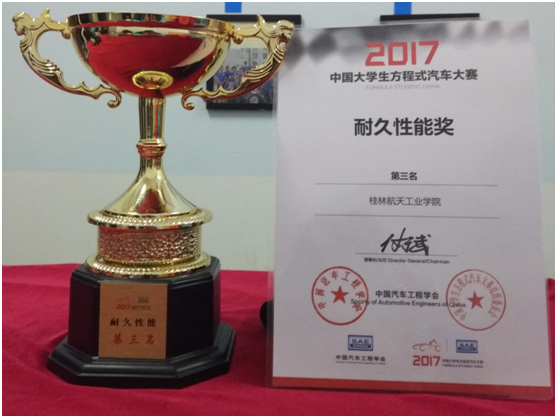 在五天的比赛中,航V车队顺利完成设计分析、制造成本分析、营销报告三个静态项目,以及直线加速、8字绕环、高速避障、耐久性能赛、燃油经济性五个动态项目,共计八个项目的比赛,从78支车队中脱颖而出,在分值最高、难度最大的耐久性能比赛中,pp电子航V3号赛车的可靠性和操控性经受住了严峻考验,两位车手沉着冷静、发挥出色,多次上演精彩的竞速超车大戏,得到赛场观众的阵阵喝彩和赞誉。经过14圈的激烈角逐,以294分(满分300分)的成绩获得耐久性能赛全国第三名。