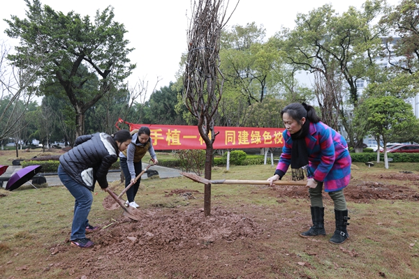 3月10日上午,易忠在北校区休闲广场参加植树活动。他倡议大家积极践行绿色发展理念,广泛参与绿色行动,主动传播绿色文化,以实际行动为校园环境贡献力量。校领导与师生代表冒着小雨种下25株樱花树。