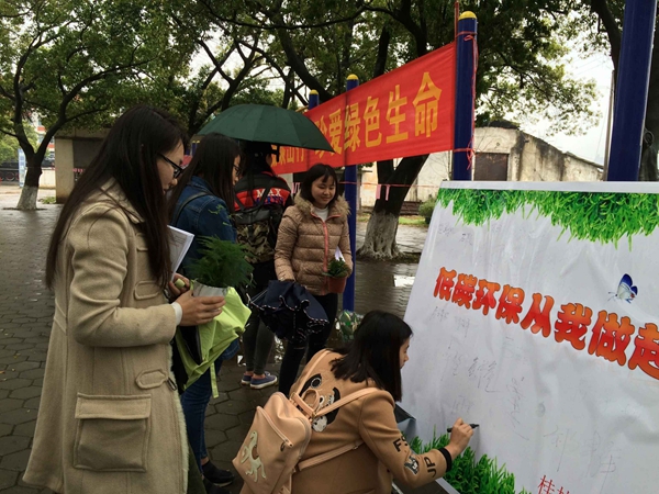 在南校区花卉中心,环保猜迷绿植领养活动如火如荼地开展,近百名师生热情参与。该活动以“倡导低碳环保,珍爱绿色生命”为宗旨,通过参加环保猜迷、在环保横幅上签名、免费领取绿植,传递低碳环保理念,唤醒大学生们的绿色环保意识,本次活动共发放绿植300盆。