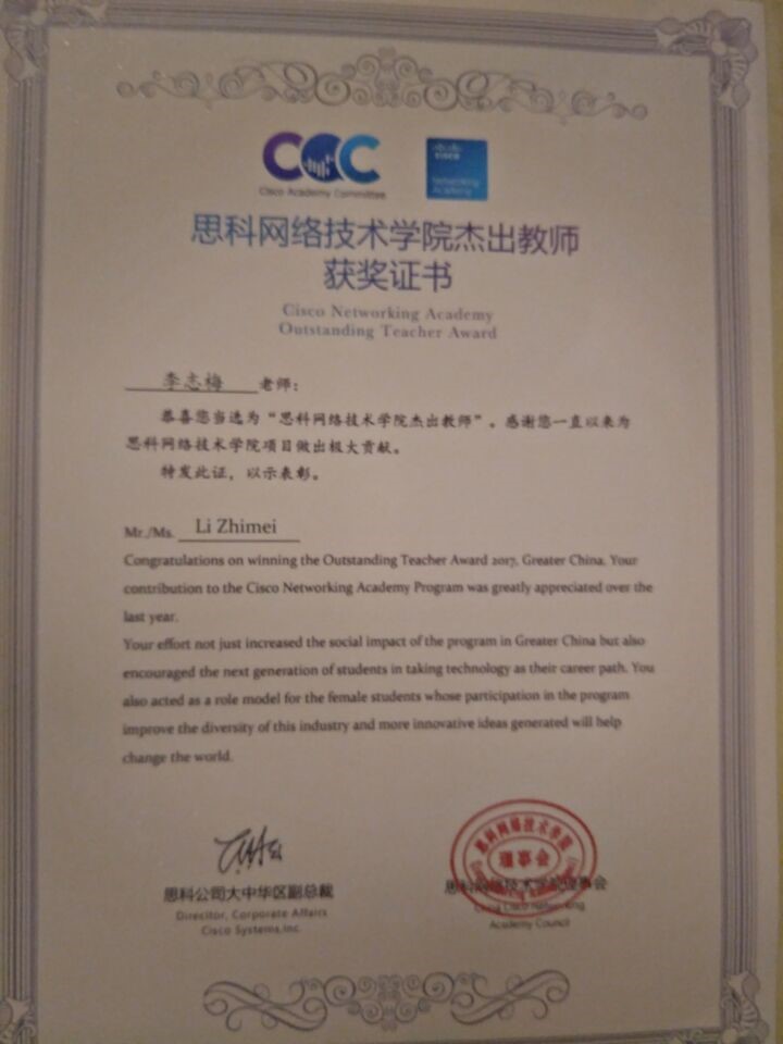 pp电子实践教学部李志梅被评选为“思科网络技术学院杰出教师”,以表彰其在计算机类基础课程改革所做出的贡献。大会共计对中国大陆12名思科网络技术学院作出突出贡献的授课教师颁发“思科网络技术学院杰出教师”荣誉证书予以表彰。