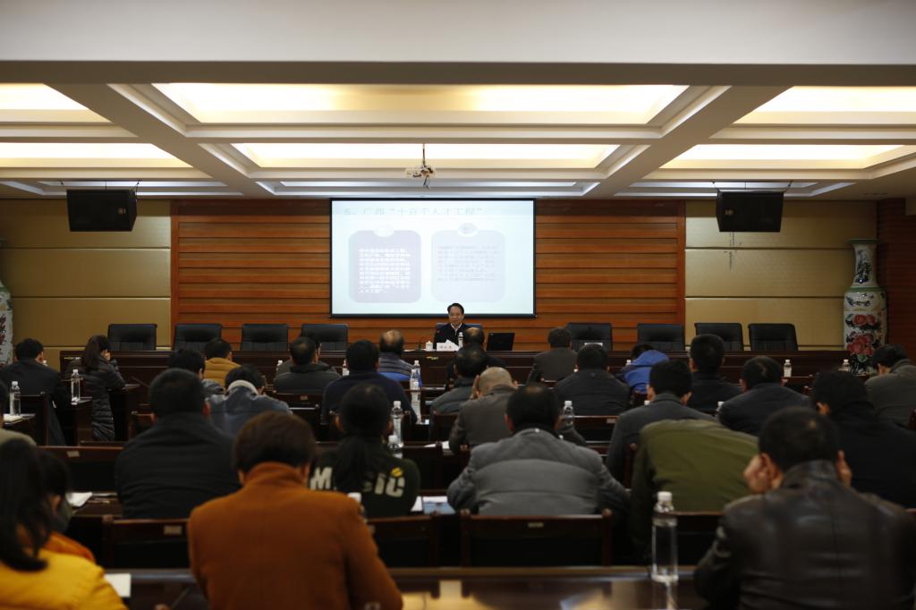 3月9日下午,应学校邀请,自治区人社厅专业技术人员管理处谢兆东处长、覃枝副处长到学校指导工作。谢兆东作《广西高层次人才队伍建设政策解读》专题报告,部分在家校领导参加,党委副书记、纪委书记黄文韬主持此次报告。