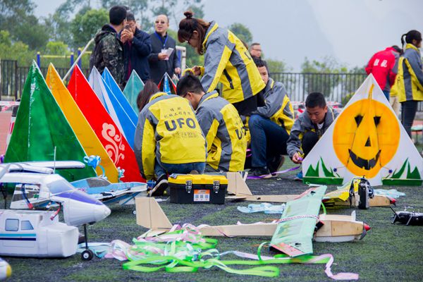 由机械工程学院飞行器制造工程的同学们带来的“空中格斗”表演,空战分红、黄两方,每方均为两架战机,每架战机各贴有10米长的彩带,双方用螺旋桨割对方的彩带,最终以彩带剩余长短来决定胜负。