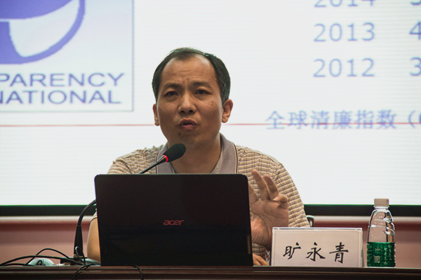 会上,旷永青教授首先以中国足球领域的腐败案为例,引导同学们理解腐败的危害以及“廉洁”的真正内涵,他指出,从宏观层面看,廉洁是中华文化传承创新的基因与血脉,是中华民族永续发展的大智慧;于个人而言,廉洁是大学生健康成长成才的护身符,是大学生处世干事创业的助推剂。随后,针对当代大学校园中发生的种种负面新闻,旷永青教授向在座同学提出了一个问题“廉洁离我们遥远么”?高校校园中出现违反校纪校规,考试作弊、抄袭论文、求职造假等不诚信不廉洁现象时有发生,足以说明腐败基因已经蔓延到了当今大学生中,然而面对贪腐现象,我们应该怎么做?他给出了答案:大学生既要洁身自好,又要勇敢地对腐败现象说不,要有自己的责任和担当,学会用法律武器与腐败现象作斗争,勇于揭露和监督,共同努力营造清廉社会环境。而在当前复杂多变的社会环境下,坚守廉洁值不值?旷永青教授用一系列案例作了说明,众多贪腐官员落马后的境遇对比瑶乡大爱校长莫振高的光荣事迹,足以证明廉洁的重要性,他告诫在座的每一位学生干部:“如果廉洁是1,不廉洁就是0,在整个人生奋斗历程里,在积累的历史功绩中,无论你取得了多大成功,无论创造了多大财富,遇上了不廉洁,其结果都会是零。”
