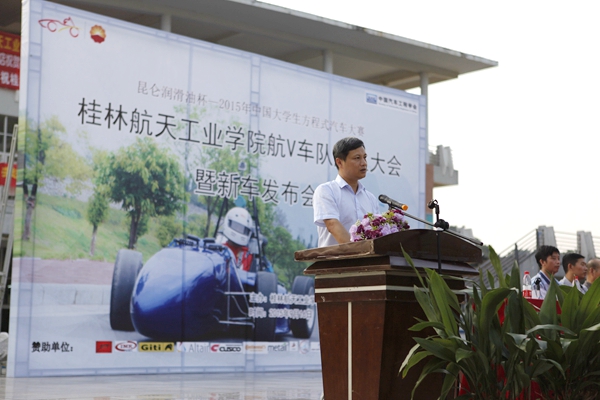 李智在会上致辞,向勇于创新、挑战自我的航v车队的师生们表示热烈祝贺。他说,学校积极鼓励师生通过实践提高应用能力和创新意识。他希望,汽车与交通工程学院认真完成好本次参赛的组织任务;指导老师们充分挖掘学生潜能;车队同学们认真对待比赛,将所学的专业知识灵活运用。