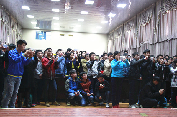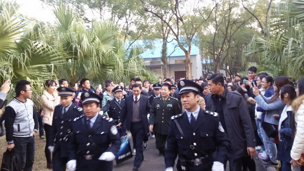 等待着,等待着,杨利伟将军刚一下车,热情的师生不满足于夹道欢迎而把英雄团团围住,现场的热情度突然高涨了起来,争着往前一睹英雄风采,更有幸福者与英雄握手,还要到了签名……一名女生兴奋地说,“杨叔叔和我握手了,握到了,真的握到了,三天不洗手……”;一名女生高高举起杨将军的亲笔签名,激动地哭了;“为了多看几眼心中的英雄”,一名男生从北校区跑到南校区一路跑、一路喊,“杨叔叔,杨叔叔”;甚至有学生说,“跑的我心脏都快要跳出来了,简直是太幸福了”……