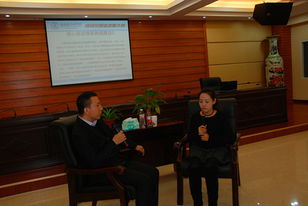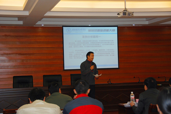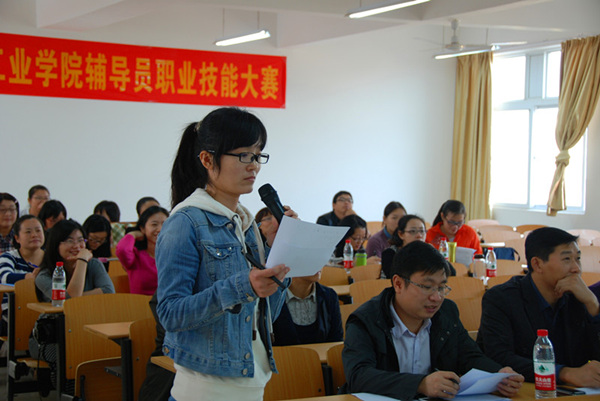 本次大赛设有自我介绍与工作展示、主题班会、主题演讲、基础知识测试、博文写作、综合知识问答赛、谈心谈话情景再现、案例分析等八个比赛项目,各系共推荐了13名种子选手全程参加了本次大赛。在学工部领导的精心策划与安排下,本次大赛赛程安排紧凑、命题紧扣大学生思想政治教育与学生实际工作。每个环节分别体现了辅导员如何开展思想政治教育工作、掌握学生日常管理事务的技能要求等鲜明主题,比赛流程严格参照自治区比赛的要求有条不紊地开展。