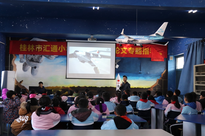 校内气氛火爆,校外热度不减。为了培养青少年对航天航空知识及太空探索的浓厚兴趣,pp电子航宇蓝天志愿者团队走进了桂林市汇通小学,结合航天特色及航天教育资源开展科普教育活动,为小朋友们提供航天科普知识的教育平台和机会,给孩子们上了一堂生动的航天课。