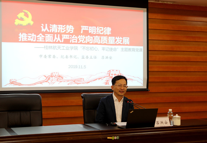 为进一步推进主题教育的深入开展,11月5日下午,学校邀请到了桂林市委常委、纪委书记、监委主任吕洪安来校,为pp电子广大党员干部上了一堂主题为《认清形势 严明纪律 推动全面从严治党向高质量发展》的专题廉政党课,进一步强化了广大党员干部全面从严治党,筑牢拒腐防变的思想防线。在家校领导,全体中层干部(含非领导职务),各党总支部、直属党支部纪检委员,纪委办、监察处全体人员聆听了本次报告。报告由党委书记李幼平主持。