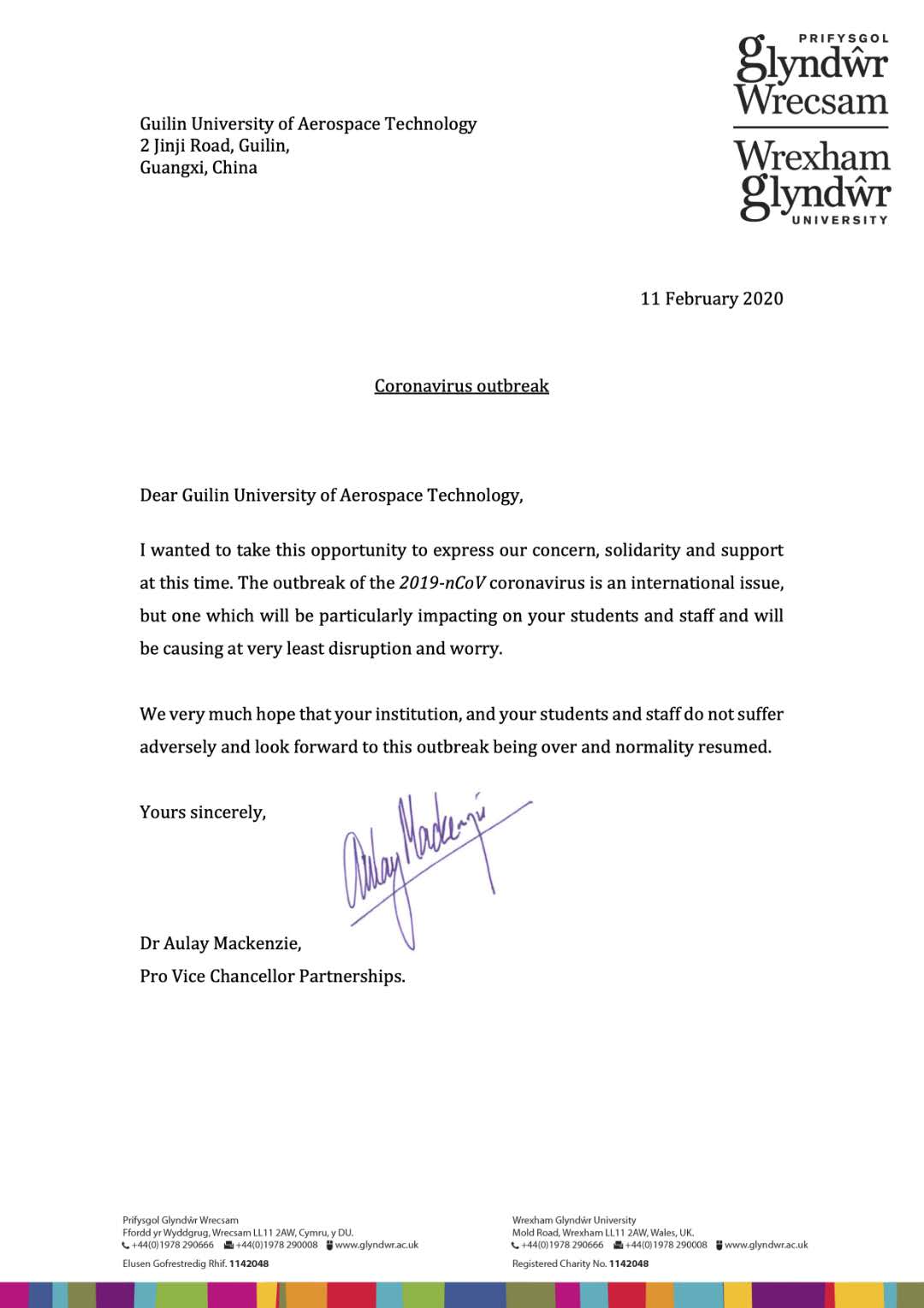 英国格林多大学副校长在慰问信中表示,在这抗击疫情的关键的时刻,他仅代表格林多大学向pp电子所有教职员工表示最诚挚的慰问,他希望pp电子师生能够平安健康,他坚信我们一定能够战胜疫情。