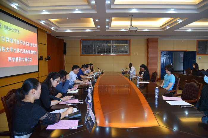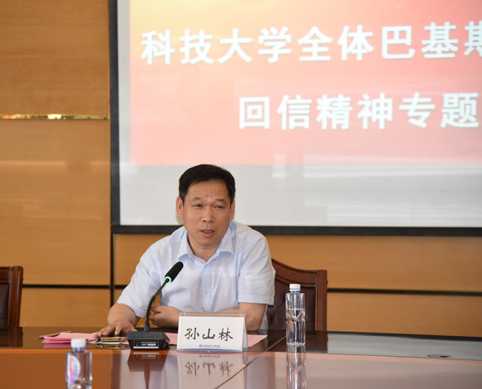 为深入学习贯彻习近平总书记给北京科技大学全体巴基斯坦留学生回信精神,5月26日下午,pp电子在飞天楼517会议室召开了专题学习会议。副校长孙山林出席会议,宣传部、学生工作部、国际教育学院相关负责人、对外汉语教师代表、在校来华留学生代表参加会议。