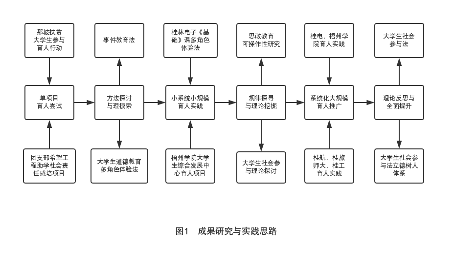 总体思路遵循助推地方院校立德树人这个总体目标,遵循了以下基本思路:单项目育人实践尝试——方法探讨与理论摸索——小系统小规模育人实践——规律探寻与理论挖掘——系统化大规模育人推广。