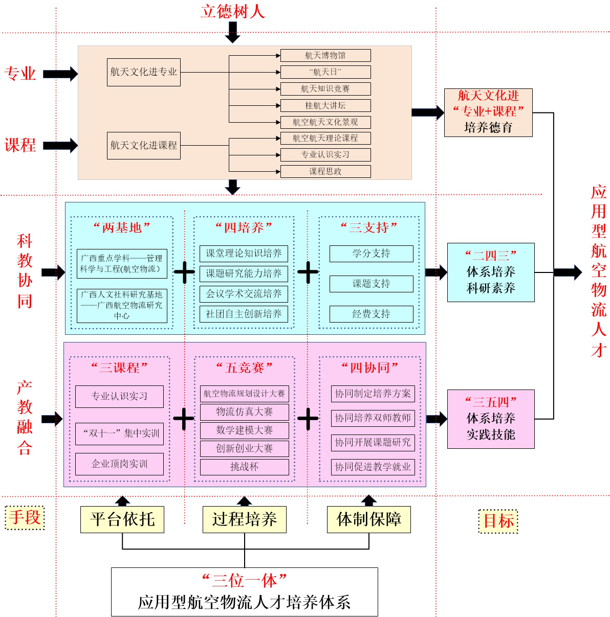 一流应用型本科核心是培养一流应用型人才,关键是要有特色应用型专业。本成果依托《基于岗位创新能力培养的物流专业实践教学体系研究与实践》等6项省部级教改项目,围绕物流工程和物流管理两个本科专业,进行理论研究和改革实践,以立德树人为根本,以“科教协同、产教融合”为手段,以科研素养和实践技能培养为重点,构建了“平台依托、过程培养和体制保障”三位一体的应用型航空物流人才培养体系。