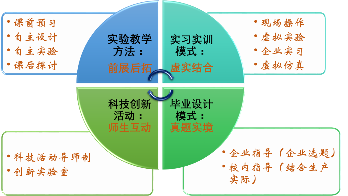 以提升学生职业能力和工程素质为目标,系统优化实践教学内容体系,将校内实验教学、校外实习实训、毕业实习、毕业设计和创新实践锻炼有机衔接,构建“基础认知-工程实践-综合应用-探索创新”梯度式实践教学体系,做到工程实践训练“大学四年不断线”。