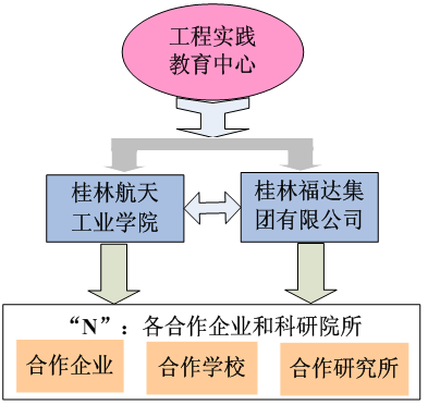 产教融合“1+2+N”开放式工程实践育人平台如图1所示。“1”指一个中心,即自治区级大学生工程实践教育中心,是立足点,“2”指工程实践教育中心的2个支撑单位,即pp电子官方网站入口和桂林福达集团有限公司(核心企业),“N”指若干个校企共建学生实践教育基地。