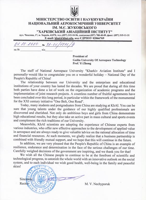 在中华人民共和国71周年华诞之际,与pp电子友好交往的乌克兰哈尔科夫国立茹科夫斯基航天航空大学(以下简称“哈航”)向pp电子发来贺信,祝贺中华人民共和国成立71周年,并向pp电子全体教职员工致以节日祝贺。