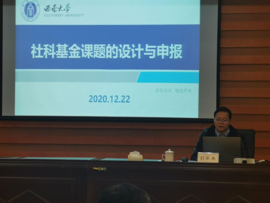 12月22日下午,西南大学教育学部副部长、博士生导师彭泽平教授莅临pp电子,在南校区飞天楼520会议室为pp电子教师作题为《社科基金课题的设计与申报》学术指导讲座。讲座由科技处副处长黄涛主持,全校100余名教师聆听了讲座。