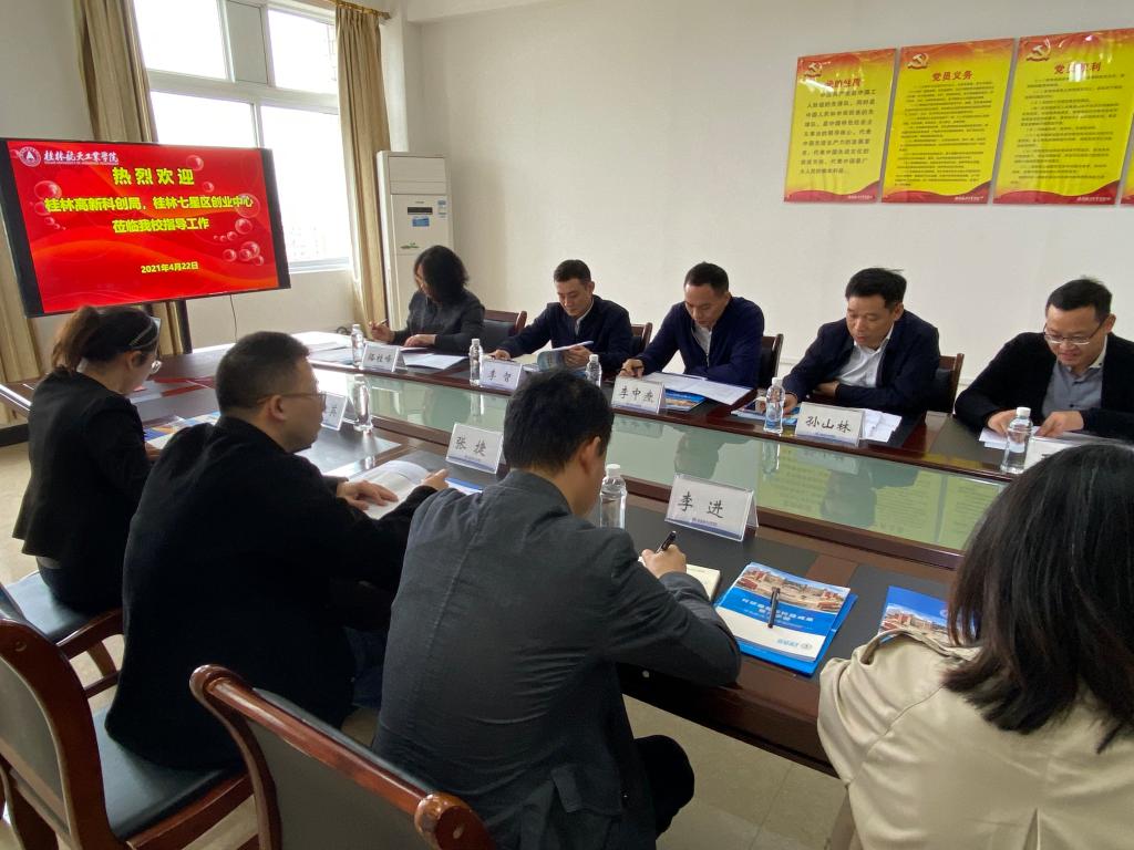 4月22日,桂林市高新科创局局长李进、桂林科技创业服务中心副主任张捷一行6人来pp电子调研。学校副校长孙山林出席会议,科技处、校团委、双创学院相关负责人参加座谈会。