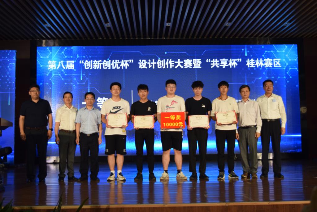 刘军、彭清银、沈秋林、唐健灵分别致辞。典礼宣读了第八届“创新创优”杯设计创作大赛暨“共享杯”桂林赛区获奖名单,本次大赛从桂林地区各高校参赛团队中共评选来自出来一等奖4名、二等奖6名、三等奖8名、优秀奖6名,与会领导嘉宾分别对获奖作品进行了深度点评。