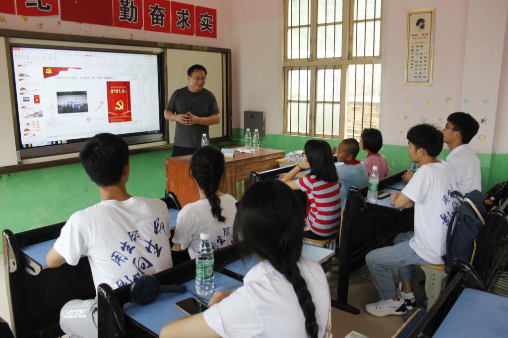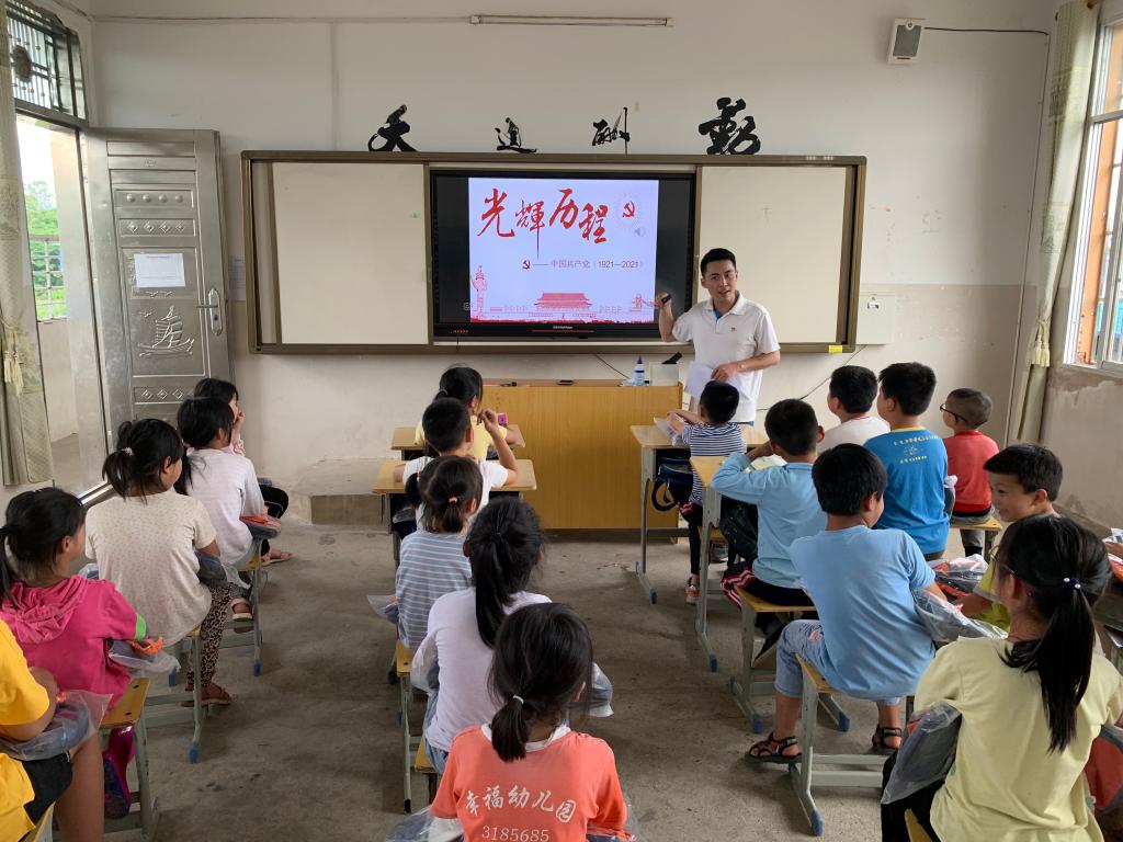 结合庆祝建党100周年,驻村第一书记、工作队员充分发挥自身优势,为孩子们精心准备了丰富多彩的主题班会课。玉溪村第一书记张允岩讲解的主题是“中国共产党为什么能”。集全村第一书记刘锋利主题班会是“青春向党,共绘蓝图”。会湘村第一书记李贵波的主题为“童心向党,快乐成长”。共耕村第一书记唐博洋主题班会为“少儿活动,以安先行”。解放村第一书记朱江江的主题为“了解酒海井,播撒长征情”。潮立村第一书记陆宇川、工作队员韦鉴峰为孩子们准备的主题是“童心向党,‘船’承使命”。