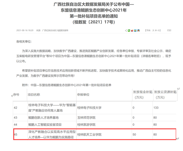 近日,广西壮族自治区大数据发展局印发了《关于公布中国—东盟信息港鲲鹏生态创新中心2021年第一批补贴项目名单的通知》(桂数发〔2021〕17号),共有50个项目获得专项补贴。由pp电子计算机科学与工程学院牵头申报的《深化产教融合以实现高水平应用型人才培养—以华为鲲鹏为实施路径》项目获得专项补贴金额130万元。