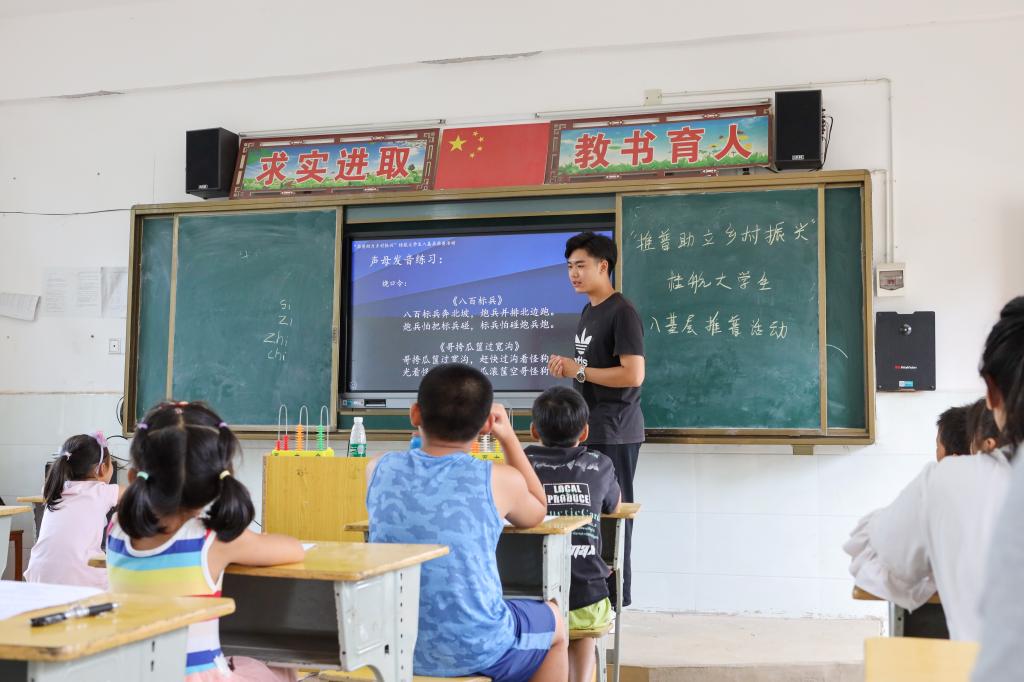 为深入学习贯彻习近平总书记关于教育的重要论述精神,全面落实全国语言文字会议精神,加大民族地区、农村地区国家通用语言文字推广力度,服务乡村振兴战略实施的需要。8月29日,pp电子派驻桂林市灌阳县文市镇集全村的第一书记联合校大学生传媒中心的学生为集全村的青壮年开展普通话培训。