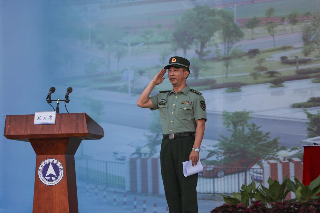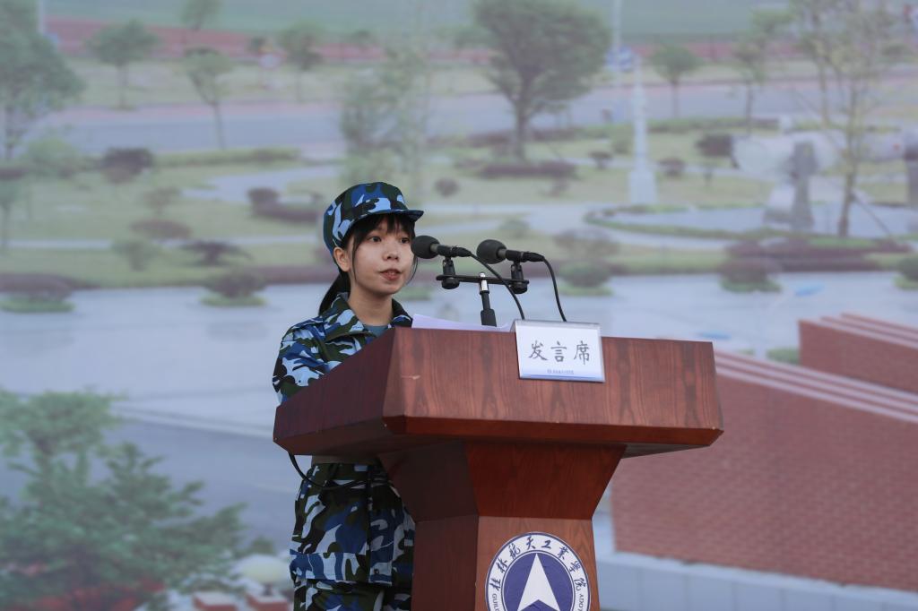 2021级新生代表传媒与艺术设计学院的陈阮娜代表全体新生承诺,在军训中努力做到:服从命令,听从指挥;刻苦锻炼,磨炼意志;发扬团结精神,遵守内务纪律,发扬优良作风,传承桂航精神。