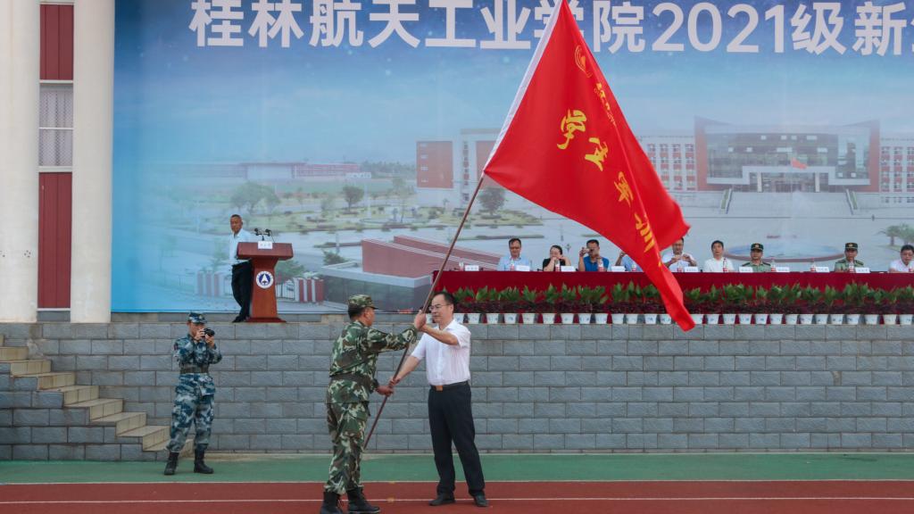 仪式上,学校党委刘迎春向2021级学生军训团授军训团团旗。