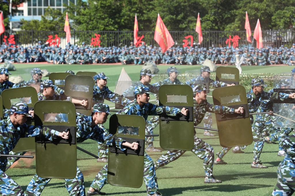 2021级新生军训会操典礼在雄壮的国歌声中正式拉开帷幕。四十七个分列式方阵伴随着昂扬的检阅进行曲迈着正步、高喊口号、精神抖擞地依次通过主席台,他们飒爽的英姿,矫健的步伐,洪亮的口号,赢得了领导及师生们的阵阵热烈掌声。分列式后,七个表演方队进行了花式方阵、刺杀操、匍匐拳、警棍盾牌术、匕首操、格斗术、红蓝对抗战术演练汇报表演,表演柔美与刚烈并济,再次引燃了现场气氛。