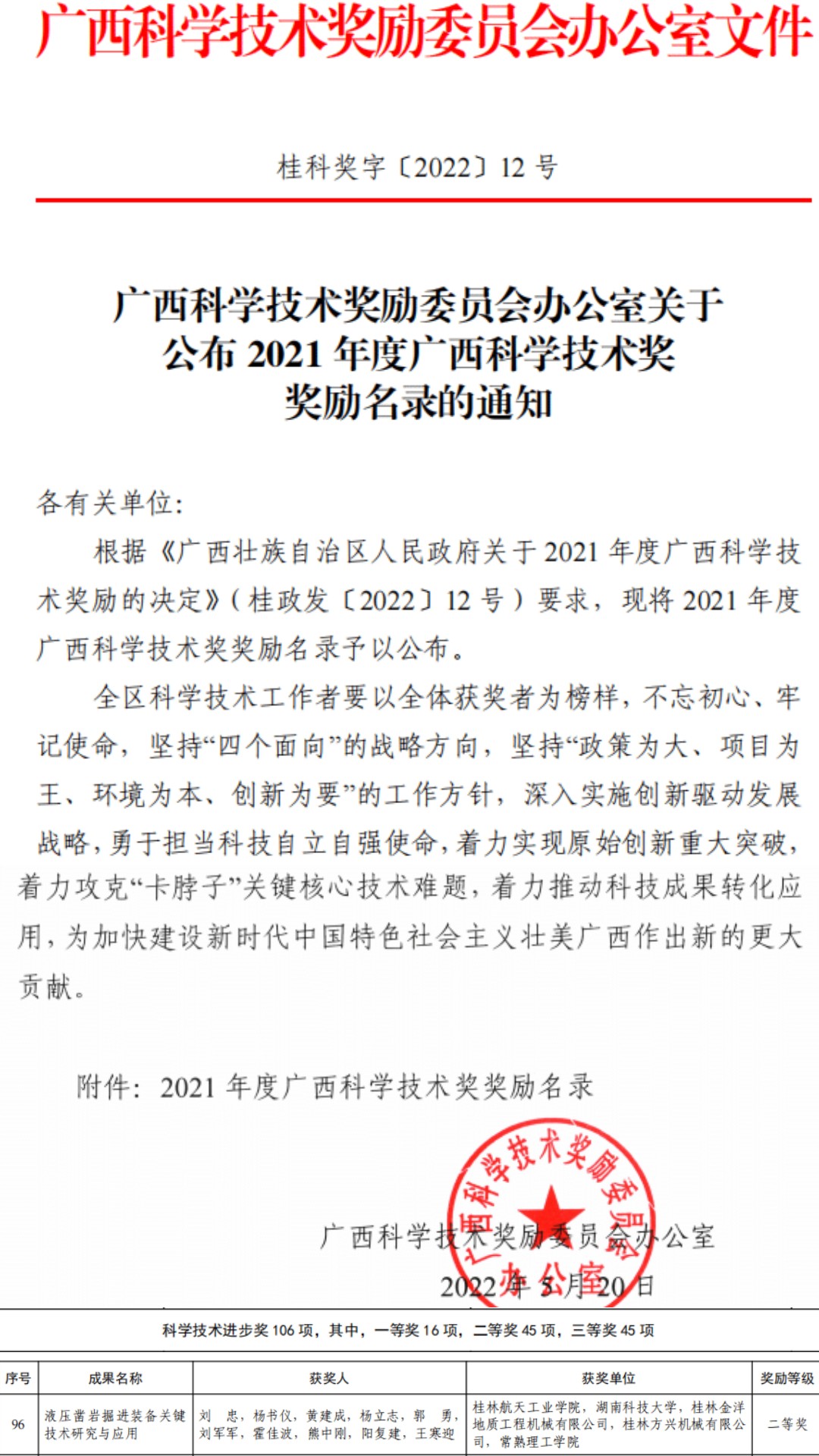 以pp电子作为第一完成单位、机电工程学院刘忠教授作为第一完成人的科研项目“液压凿岩掘进装备关键技术研究与应用”荣获广西壮族自治区2021年度科技进步奖二等奖。这是pp电子首次以第一完成单位获得广西科技进步奖二等奖。该项目得到了湖南科技大学、桂林金洋地质工程机械有限公司、桂林方兴机械有限公司和常熟理工学院等兄弟单位的大力支持。